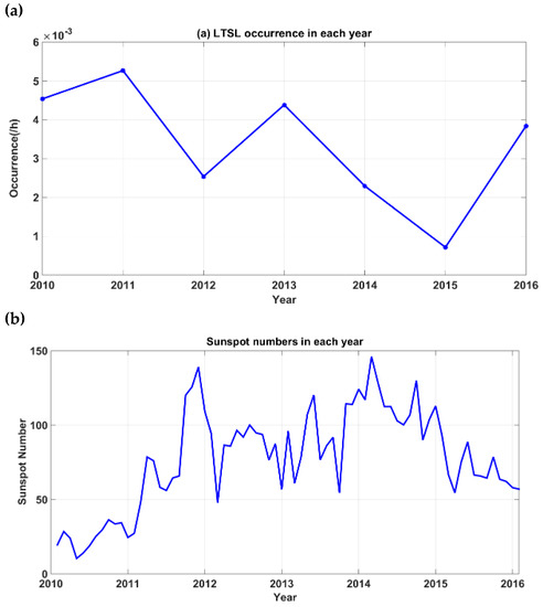 (a) The inter-annual variations of LTSL occurrence rates from 2010 to 2016. (b) The sunspot numbers from 2010 to 2016.