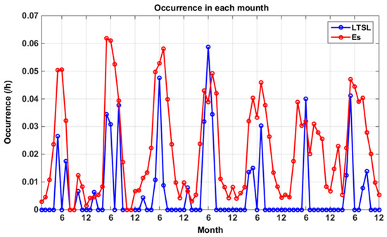 The monthly occurrence rates of LTSLs and Es (occurrence rates = the number of LTSL or Es in each month/the total observational time in each month).
