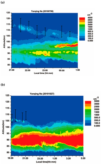 The LTSLs were selected according to the following criteria: The peak altitude of the LTSL is higher than 105 km [18,19]; the LTSL is separated from the main sodium layer [21]. To identify more typical LTSLs, we added two additional criteria: The LTSL lasts at least one hour from its formation to its disappearance for the observations or until it merges into the main sodium layer below 105 km; and when the LTSL appeared at its highest altitude, the peak density of the LTSL is greater than one-twentieth of the peak density of the main sodium layer. Figure 1 shows an LTSL case from 6 July 2010.