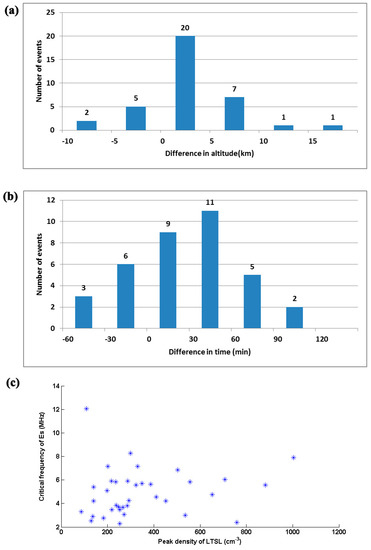 Figure 6 shows that in the two cases, the heights and local times of the Es layers are close to the LTSL peaks. We listed the time differences and altitude differences between the LTSL and Es. Figure 7 shows that for most cases, the local times, altitudes, and densities of the LTSLs were relevant to those of the Es. Most of the LTSLs and Es were observed within the range of 105–125 km, with average altitudes of 109.5 km and 112.5 km, respectively. The difference of the average altitudes of SSL and Es was approximately 10 km [11], while that between LTSL and Es was only 3 km. In thirty-four cases, the height differences between the LTSL peaks and Es were less than 10 km (94%). Among these, there were twenty-five cases in which the height differences between the LTSL peaks and Es were less than 5 km (70%). In addition, there are twenty-nine cases wherein the Es were higher than the LTSLs (81%; shown in Figure 7a). The differences of the occurrence times between the LTSLs and Es were less than 120 min, and most of the Es layers occurred a little earlier. There are fifteen Es and LTSL cases with formations within half an hour (42%), and the time intervals of the fourteen Es and LTSL cases were a half-hour to an hour (39%). In addition, the time intervals of five Es and LTSL cases were approximately an hour to hour and a half (14%). Only two Es layers occurred more than ninety minutes before the LTSLs (shown in Figure 7b). In Figure 7c, the horizontal axis represents the peak density of the LTSLs, and the vertical axis represents the critical frequency of the Es. An increased density of the LTSL corresponds to an increased critical frequency of the Es, especially when the density was less than 600 cm−3. The high correlation between LTSLs and Es implies that LTSLs are likely directly transformed from the sodium ions in Es or Es and LTSLs are probably from the same source.
