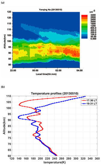 Over the past twenty years, a much unexpected sodium density increase feature was found in the low thermosphere via lidar data. Collins et al first reported “a large sporadic sodium layer near 109 km” with a peak density close to the peak density of the main sodium layer that lasted 15 min and was found at Poker Flat, Alaska (67° N, 147° W), during an active aurora [17]. Gong et al. reported a two-hour “double sodium layer” with a peak density of approximately 25% that of the main sodium layer located at 112 km in Wuhan (31° N, 147° E) [18]. In recent years, researchers have observed several similar LTSLs at high, middle, and low latitudes. These LTSLs have instigated considerable and prolonged concern. Wang et al. reported 17 “double sodium layers” (105 km–130 km) over Beijing, China, during 2009–2011 [19]. Xue et al. reported two “thermospheric enhanced sodium layers” separate from the main layer at approximately 120 km with densities an order of magnitude less than the peak density on 10 March and 10 April 2012 at Lijiang (26.7° N, 100.0° E), China [20]. Dou et al. compared the peak densities, peak altitudes, FWHMs, and peak times of the “thermospheric enhanced sodium layers” observed at Beijing (40.2° N, 116.2° E), Hefei (31.8° N, 117.3° E), Wuhan (30.5° N, 144.4° E), and Haikou (19.5° N, 109.1° E) [21]. Ma et al. surveyed 11 “high-altitude (above 105 km) sporadic sodium events” at Qingdao (36° N, 120° E), China, based on 430 h of data from December 2007 to June 2012 and these separated sodium layers are called low thermospheric sodium layers (LTSL) [22].