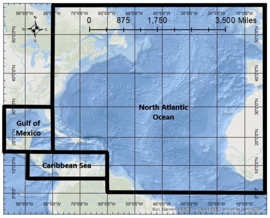 Current research suggests the warming climate may produce more intense TCs with a higher probability of undergoing RI during their life cycle [,,]. The increased likelihood of rapidly intensifying TCs necessitates the development of an RI climatology spanning the current North Atlantic record. While multiple studies have focused on the spatial origin patterns of RI, as well as potential forcing mechanisms that may be integral to the initiation of the RI process [,], [,,], there have been no studies dedicated to an analysis of the entire Atlantic basin record (1851 to 2017) with specific emphasis on possible trends in time, spatial clustering, and climatological characteristics per sub-basin. A comprehensive assessment of RI processes in the Atlantic basin can provide important information to researchers, thus allowing more accurate forecasts to be disseminated to potentially affected communities. This paper assesses temporal and spatial trends in RI hurricanes throughout the Atlantic Basin historical record as an in-depth statistical analysis to supplement the existing literature. Figure 1 shows the study area and each delineated sub-basin.