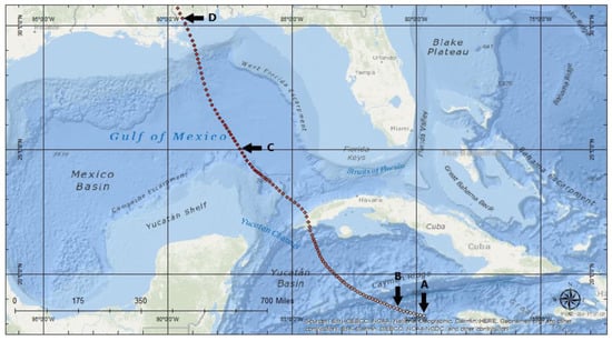 Schematic of defined rapid intensification (RI) hurricane processes using Hurricane Camille’s track in 1969 as an example. (A) Hurricane origin point, (B) RI genesis point, (C) lifetime maximum intensity (LMI) point, and (D) landfall point.