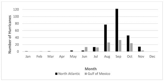 Seasonality and frequency calculations were done to first examine potential similarities and differences between the full record and one subset to a time of more data confidence. Second, these calculations were deemed necessary to investigate potential patterns and variations in RI storm sub-basin development, intensity, and prevalence. Figure 3 shows a monthly frequency analysis per sub-basin (Gulf of Mexico and North Atlantic). It reveals a similar trend to typical North Atlantic hurricane seasons, with the highest occurrences of RI storms in September for both regions. However, Gulf of Mexico RI events tend to occur more regularly throughout the summer months of June, July, and August, while Atlantic storms peak in August, September, and October. The steady activity within the Gulf of Mexico during the summer months may be correlated with higher SSTs (sea surface temperatures) and shallower water, thus allowing for consistent development and maturation of RI hurricanes [].