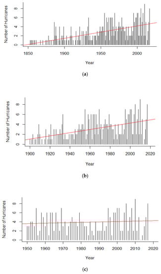 Hurricanes initiating the RI process within the North Atlantic sub-basin increased by a factor of 1.4% (1851–2017), as illustrated in Figure 8a. The subset analysis (1900–2017) still maintained an increase by a factor of 1.2%, as shown in Figure 8b. The years 1950 to 2017 saw a factor increase of 0.4%, shown in Figure 8c. Table 6 depicts the coefficient estimates, p-value, and chi-square p-values on the residual deviances for both the full and subset analyses.