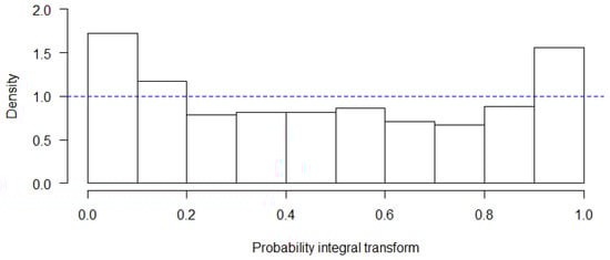 To measure the appropriateness of model fit, several different procedures were used. First, assessment of the model’s residual deviance was employed. A probability integral transform (PIT) histogram was created to examine if the RI hurricane count values were able to be converted to random variables having a standard uniform distribution with the assumption that the original data were modeled as random variables from any given continuous distribution []. The resulting graphic, Figure 5, exhibits a moderate U-shaped distribution, indicating a potential lack of transformation uniformity and, therefore, a poor model fit.
