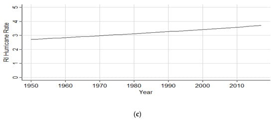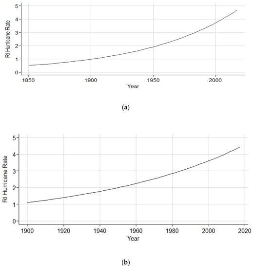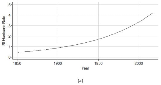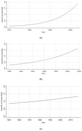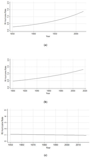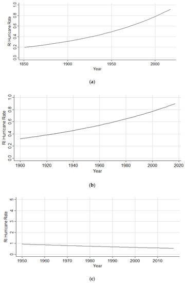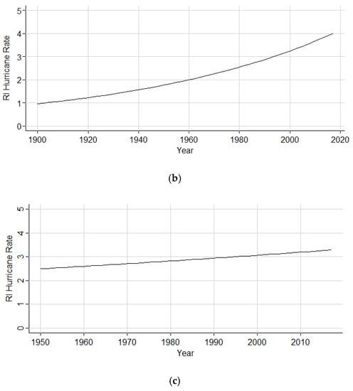 Hurricanes initiating the RI process within the Gulf of Mexico increased by a factor of 1.4% (1851–2017), as illustrated in Figure 10a. The subset analysis (1900–2017) still maintained an increase by a factor of 1.2%, as shown in Figure 10b. However, in Figure 10c, the rate is shown to decrease by a factor of 0.3%. Table 8 depicts the coefficient estimates, p-value, and chi-square p-values on the residual deviance for both the full and subset analyses.