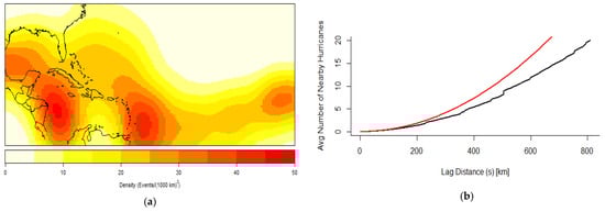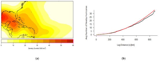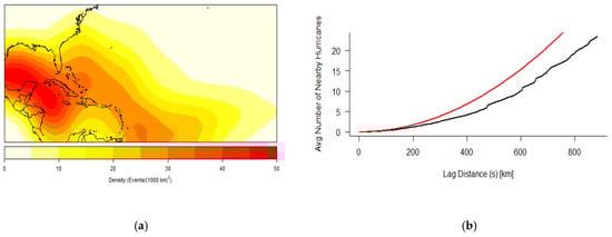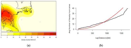 (a) Kernel density analysis of RI hurricanes at their initial RI completion points (1851–2017). (b) Generalization of K graph for inhomogeneous data of initial RI completion points with the empirical (black) curve above the theoretical (red) curve for lag distances 500 km and lower, indicating the likelihood of clustering for all distances up to this point.