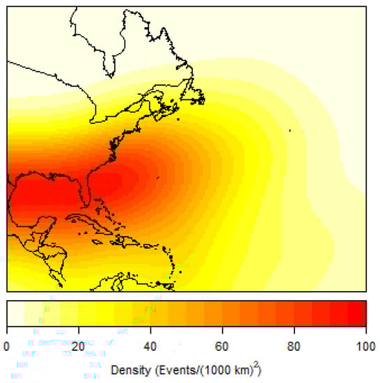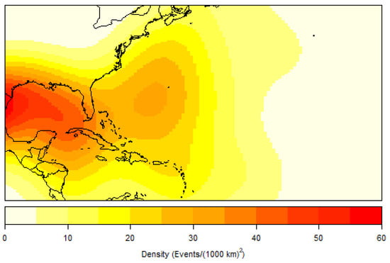 with K as the kernel function, which is taken to be a symmetric probability density []. A kernel density analysis was implemented to model RI hurricane origin, initial RI genesis, landfall, and LMI points for all 392 RI defined hurricanes within the dataset. All LMI points of non-RI hurricanes were also modeled using a kernel density analysis for a comparative discussion.