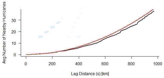 Generalization of K graph for inhomogeneous data of RI LMI points with the empirical (black) curve above the theoretical (red) curve to a lag distance of 350 km, indicating significant clustering up to this point of distance between hurricanes.