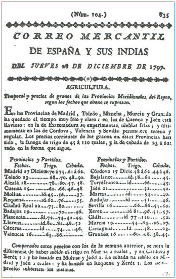All the periodical’s editions start with an agricultural report qualitatively describing the general weather conditions and indicating the grain prices. The information is classified by province, taking into account the territorial division at that time. The reports are a brief summary in which the editors give information for each province. Therefore, the information provided is basically a spatial “average”, although sometimes differences are indicated between several localities within the same province.