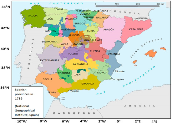 Spanish provinces in 1789 according to the Atlas Nacional de España [12].