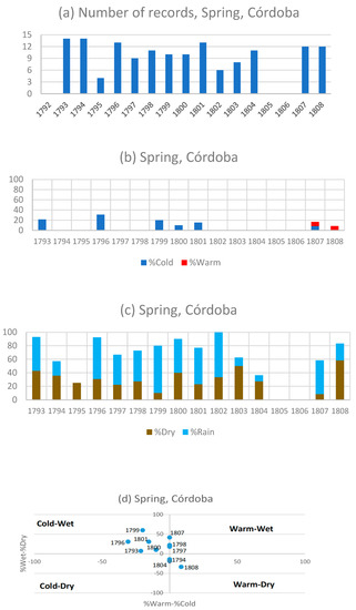 (a) Number of spring records in Córdoba from 1792 to 1808. (b) Percentage of records indicating cold (blue) and warm (red) conditions. (c) Percentage of records indicating dry and wet conditions. (d) Characterization of the combined temperature and rainfall conditions in Córdoba from 1792 to 1808. Years are indicated.