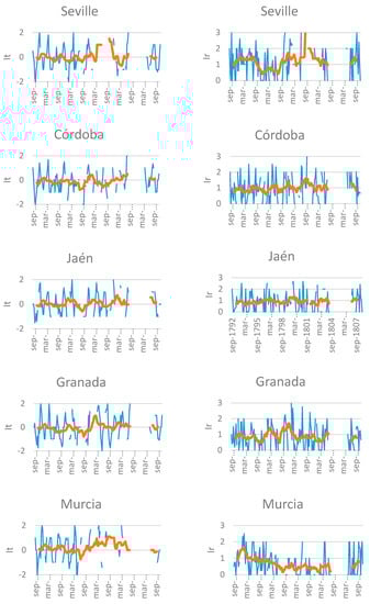 Figure 4 shows the temporal series of the monthly indexes It and Ir for the five selected provinces. The 13-month moving average allows us to visualize the temporal evolution of the indices by filtering the intra-annual seasonal variations. Although gaps exist, especially around 1805, that prevent conclusive results from being established, the increase in the It index from 1799 is evident. For the period as a whole, the average value of the It index along with the standard error in the mean estimation is −0.08 ± 0.08 in Sevilla, −0.10 ± 0.07 in Córdoba, +0.03 ± 0.07 in Jaén, −0.05 ± 0.08 in Granada, and +0.15 ± 0.10 in Murcia, suggesting the existence of a temperature gradient from west (colder conditions) to east (warmer conditions). The rainfall index Ir shows a maximum around 1799–1800, and a clear decline in the eastern provinces, in Granada from 1799 and in Murcia practically from the beginning of the series. The average values for the Ir index are +1.12 ± 0.08 in Sevilla, +0.98 ± 0.07 in Córdoba, +0.91 ± 0.07 in Jaén, +0.86 ± 0.06 in Granada, and +0.72 ± 0.06 in Murcia. This result suggests a decrease in rainfall along the West–East axis, from those provinces most influenced by Atlantic flows (Sevilla, Córdoba) to the eastern end (Murcia), where mechanisms of Mediterranean origin predominate.