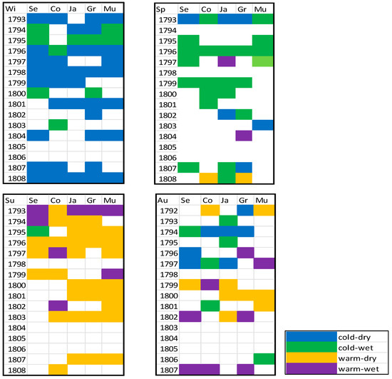 Figure 5 shows the distribution of the seasons of the year classified as warm–wet, warm–dry, cold–wet and cold–dry, for each of the seasons of the year and the five provinces selected. There was a marked seasonality (common to the five provinces), with cold winters, warm summers, and spring and autumn as transitional seasons. The predominance of cold–dry conditions in winter (e.g., in 1793, 1796, 1798, 1801, and 1808), warm–dry conditions in summer (1796, 1803, 1807), and cold–wet conditions in spring (1796, 1799) is evident. The main differences appear in the autumn, indicating a certain transition from the west (wet conditions in Córdoba and Sevilla) to the east (warm-dry autumns in Murcia) for this season, with Jaén and Granada as transitional provinces. Thus, for example, the autumn of 1794 was cold–wet in Sevilla and cold–dry to the east, while the autumn of 1801 was cold–wet in Córdoba and warm–dry in Murcia.