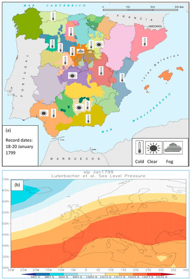 During the period 1792–1808, there was a predominance of cold and dry winters in the study area. Figure 6a shows an example of this. The records dated between January 18th and 20th, 1799 were used to produce this map (Table S1 of the Supplementary Material gives comments for each province). Given the weekly nature of the records, these conditions correspond on average to the period from January 11th to 19th of that year. One can see that, in all of the provinces with information, there are references to cold and sunny weather, including the appearance of mist in the interior of the peninsula. These conditions usually occur when the Iberian Peninsula is under anticyclonic conditions in the winter months [25], as reflected in Figure 6b, which shows the average value of the pressure field at sea level (SLP) for the month of January, 1799 [26].