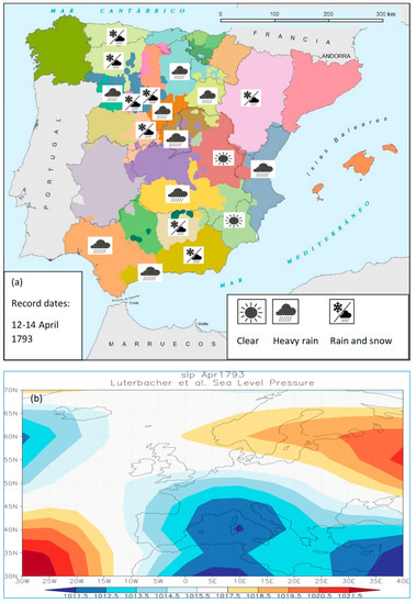 Figure 7a shows an example of a cold and wet spring. In this case, the records were dated between April 12th and 14th, 1793, indicating the predominant conditions between April 5th and 12th of that year (Table S2 in the Supplementary Material). The records for April 13th in Sevilla and Málaga indicate abundant rains. Heavy rains and snowfall were widespread in the IP, except for two eastern provinces, Murcia and Cuenca. This map can be interpreted in terms of the predominance of cyclonic conditions with north-westerly flows of Atlantic origin, a typical spring circulation [27], as can be seen in the reconstruction of the average SLP field for April 1793 (Figure 7b).