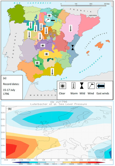 Figure 8a shows an example of warm, dry summers. These are records dated between July 15th and 17th, 1796, thus indicating the conditions for the period between 8th and 16th July of that year (Table S3 of the Supplementary Material). It highlights the information on easterly winds in the province of Burgos and the mild temperatures in Valencia, probably resulting from predominant anticyclonic conditions, which would cause easterly flows across the IP of Mediterranean origin, helping to smooth the temperatures on the Mediterranean front [28]. Figure 8b shows the reconstruction of the average SLP field in July 1796.