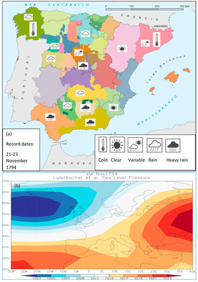 Figure 9a shows an example of autumn conditions. This corresponds to records dated between 21st and 23rd November 1794 (Table S4, Supplementary Material), thus indicating the prevailing conditions between 14th and 22nd November of that year. There was rainfall all across the western half of the IP, which was especially intense in the southwestern provinces, whereas the weather in the east was dry, in Aragon and Murcia. There was cold weather to the north in Galicia and Catalonia. These conditions seem to reflect the advection of moist air masses of Atlantic origin [27], as seen in the reconstruction of the average SLP field corresponding to November of that year (Figure 9b), reflecting the predominance of a zonal circulation over the IP. Situations of this type would explain the differences found along the west–east axis at this time of the year.