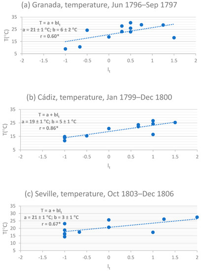 Figure 10 shows the results comparing the It index and the EMOSSv2 instrumental data in three cases: Granada (June 1796–September 1797; Gr1796–1797 in EMOSSv2), Cádiz (January 1799–December 1800; Ca1799–1800 in EMOSSv2), and Sevilla (October 1803–December 1806; Se1803–1806 in EMOSSv2; Cádiz and Sevilla belong to the same province in the CMEI). In all cases, the temperature was measured at noon. The monthly average of daily midday temperatures can be considered as a good approximation of the monthly average for the daily maximum temperatures [32]. In all three cases, the correlation coefficient between the monthly It index and the average monthly temperature is significant at the 95% confidence level, despite the limited amount of data. If we accept the calibration shown in Figure 10, applying the regression equation to the average It index value for the whole period allows us to estimate the average value of the daily maximum temperatures during the period studied. The results are 20 ± 2 °C in Granada, 18 ± 1 °C in Cádiz and 21 ± 1 °C in Sevilla. We can compare these values with the annual mean values corresponding to a modern reference period, such as the period from 1961–1990 [33]: 22.5 ± 0.1 °C in Granada, 21.3 ± 0.1 °C in Cádiz and 24.7 ± 0.1 °C in Sevilla. These results indicate that the study period was colder, in the order of 2 to 3 °C, than the reference period.