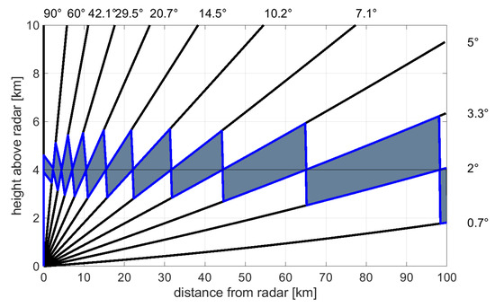 Radar scan strategy for a single azimuth. The altitudes and distances scanned for each of the 12 elevation angles are shown. The shaded regions illustrate the uncertainty of the radar observation at 4-km altitude.