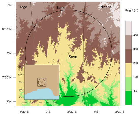Meso-NH domain for the 200-m simulation, colour-shaded is the orography. The domain for the 1-km simulation is shown in the insert. The circles indicate the 100-km range of the X-band radar located at Savè.