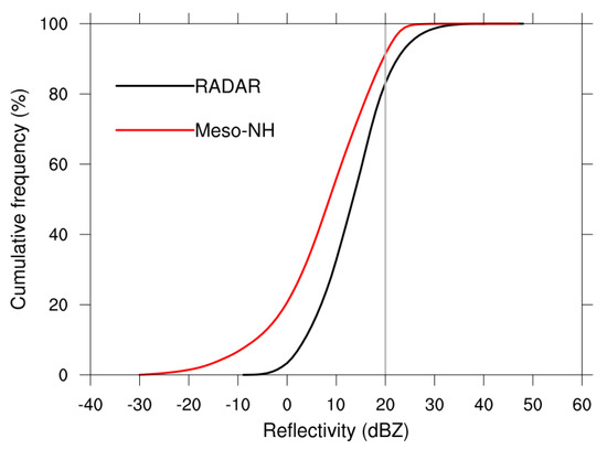 Cumulative distribution function of the maximum 2-D reflectivities from 03:00 to 08:00 UTC 24 July 2016 at 5-min temporal resolution on a 1-km grid for the X-band radar and Meso-NH computed inside the radar range. For the radar, 16.9% of the reflectivity values lie above 20 dBZ, whereas only 8.6% of the simulated reflectivity values exceed 20 dBZ.