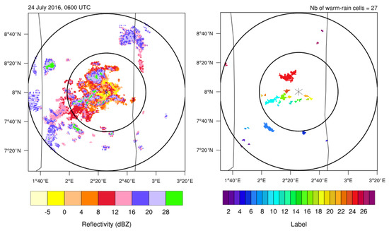 Left: horizontal projection of maximum reflectivity as retrieved from the X-band radar. Right: warm-rain cells detected with the clustering algorithm described in Section 2.3, labeled from 1 to 27. The inner and outer circles have 50- and 100-km radius, respectively.