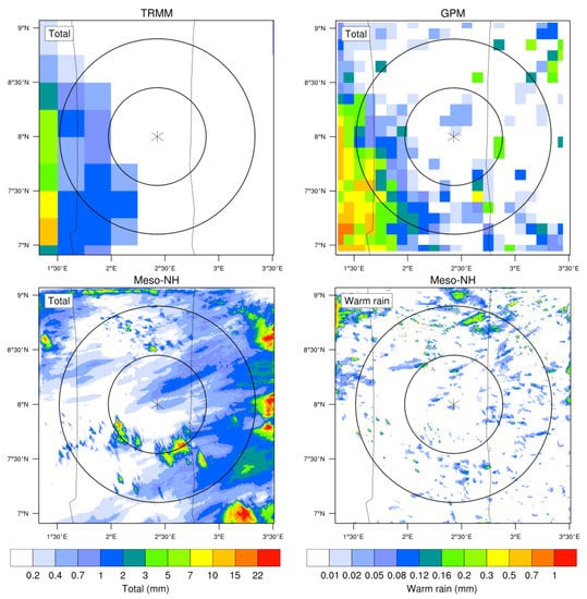 Maps of total accumulated rainfall from 03:00 to 09:00 UTC, for TRMM, product 3B42V7 (top left); for GPM, product IMERGV06B (top right); for Meso-NH (bottom left) and for Meso-NH but only the accumulated warm rain (bottom right). Note that the labels of the colorbars differ between the maps of total and warm rain.