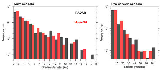 The 5-h analysis of warm-rain cells shows that 78% of the 1057 observed ones have diameters between 2 and 5 km, and only 5% have diameters larger than 10 km. Among the 225 warm-rain cells that were tracked at least twice, approximately two-thirds exist for 5 or 10 min, and approximately one-third exist for 15 min to 1 h. Only a residual percentage of tracks last longer than 1 h. Although the number of both instantaneous and tracked warm-rain cells is roughly half in the simulation, the model reasonably captures the size and lifetime relative frequency distributions.