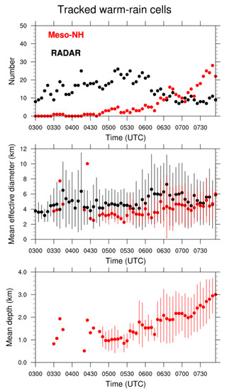 Time series of the number, effective diameter and depth (only for the simulation) of the tracked warm-rain cells, corresponding to those represented in Figure 9 and Figure 10. The dots show the mean value and the error bars represent the standard deviation for the effective diameter and depth.