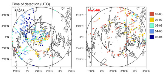 Spatial distribution of the tracked warm-rain cells detected by the X-band rain radar (left) and simulated (right) from 03:00 to 08:00 UTC, at a 5-min temporal resolution. The dots represent the location of the centre of mass of the warm-rain cells; the solid dots show the first detection and the open circles the rest of the trajectory for each track. Colors indicate the time when the warm-rain cells are identified.