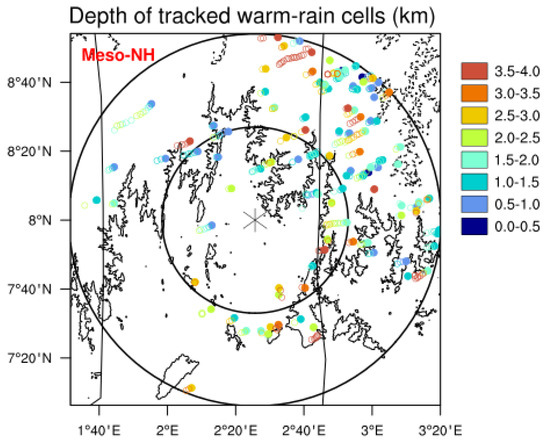 Figure 9 and Figure 10 show the spatial distribution of the tracked warm-rain cells; the colors display the hour of detection for the radar and the LES in Figure 9 and the simulated depth of the warm-rain cells in Figure 10. The solid dots depict the first detection of each track, the empty dots depict the consequent detections. The majority of the observed nighttime warm-rain cells (from 03:00 to 06:00 UTC) are located inside the outer 50-km radar range, in the western half of the domain, whereas the daytime ones (fewer in number) are mainly in the inner 50-km range, some of them lying slightly south. The simulated tracked warm-rain cells, less numerous, are generally distributed over the northeastern quadrant, as seen from Figure 8. The vast majority appear after 06:00 UTC. The observed nighttime warm-rain cells present higher tops. An analysis of MSG-derived brightness temperature indicates that during the nighttime, the observed warm-rain cells tend to develop near cold cloud tops above the 0 C altitude (not shown), and probably correspond to transient stages of deep convection. Some of them are located in the vicinity of the MCS. In the simulation, the vertical extension of the clouds covers the full range of depths.