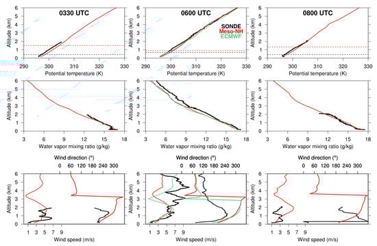 The vertical profiles of potential temperature, water vapor mixing ratio and wind speed and direction from the radiosoundings at Savè and from the simulation are shown in Figure 11 at 03:30, 06:00 and 08:00 UTC. Profiles of the same variables are also displayed for the ECMWF operational analysis at 06:00 UTC (i.e., when available). The observed potential temperature shows the static stability of the atmosphere at 03:30 and 06:00 UTC. At 08:00 UTC, the daytime development of the boundary layer causes a neutral stratification in the first 200 m. The observed water vapor mixing ratio at the surface takes values between 16 and 17 g kg, then it decreases with altitude. These near-surface values of moisture content lie within typical values at the Savè site [17]. The profiles at 03:30 and 06:00 UTC are moister than at 08:00 UTC in the lowest 2 km, probably due to daytime mixing. At 03:30 UTC, the observed wind speed shows a maximum of more than 6 m s at around 700 m altitude, with a southwesterly direction. This is the signature of the nocturnal low-level jet, with an intensity and core height typical of Savè [34,35]. At 06:00 UTC, the low-level jet has disappeared and southwesterlies of 3 to 7 m s are observed up to around 2 km, corresponding to the monsoon flow. The mean depth and wind speed of the monsoon layer at Savè are 1.9 km and 6 m s [17]. At 08:00 UTC, the wind speed shows two maxima of 3–4 m s.