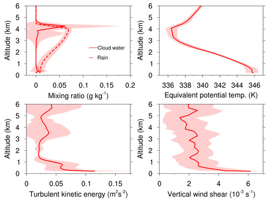 Vertical profiles of mean cloud and rain water, equivalent potential temperature (), turbulence kinetic energy (TKE), and vertical wind shear inside the simulated tracked warm-rain cells with depths smaller than 2 km. The shaded contours correspond to the standard deviation among the individual profiles of the warm-rain cells. Individual profiles are taken at their center of mass.