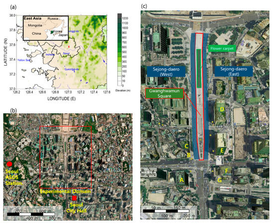(a) Location of experimental site (red closed diamond) in Seoul Metropolitan Area, Korea, East Asia; (b) satellite image near the experimental domain; (c) location of Gwanghwamun Square and Sejong-daero Streets (East and West) and Buildings A–G in the enhanced 3-dimensional building map near the experimental site.