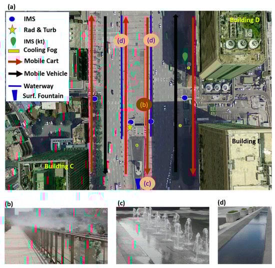 (a) Detailed location of fixed instruments or sensors and moving routes of mobile vehicle and cart with cooling fog measurement system, historic waterway, and surface fountain during the building-block urban meteorological observation experiment (BBMEX), (b) cooling fog, (c) surface fountain, and (d) historic waterway.