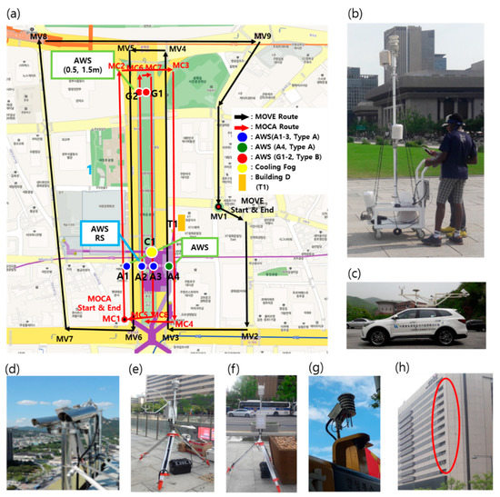 (a) Location of fixed instruments and sensors, and MOCA and MOVE during the BBMEX, (b) MOCA, (c) MOVE, (d) thermal infrared imagery, (e) radiation and turbulence measurement system, (f) integrated meteorological measurement system, (g) integrated meteorological sensor installed over public telephone box, and (h) integrated meteorological sensors deployed at 7 levels outside building D.