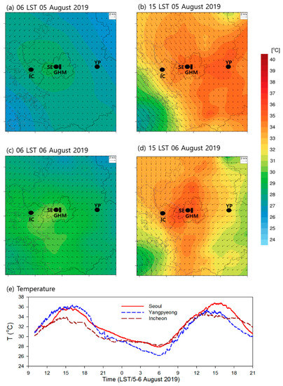 Horizontal distribution of air temperature and wind in Seoul Metropolitan Area at (a) 0600 LST, (b) 1500 LST on 05, (c) 0600 LST, and (d) 1500 LST on 06 August 2019, and (e) time series of air temperature observed at the Seoul (SE, red), Yangpyeong (YP, blue), and Incheon (IC, brown) automatic synoptic observation system (ASOS) stations. The location of the stations and the Gwanghwamun (GHM) campaign area are indicated by black filled circles and a rectangle, respectively.