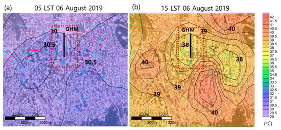 Figure 5 shows the horizontal distribution of temperature obtained by the AWS network operated by kt company on 0500 LST and 1500 LST on 6 August 2019. The AWS sensors of the kt network (ktWSs) were installed at a height of 2 m (a.g.l.) above the public telephone box on sidewalks in street canyons (Figure 3g). The air temperature was higher than that at the Seoul station by 2 °C at 0500 LST but did not show considerable spatial differences among stations (Figure 5a). The GHM domain showed a slightly lower temperature than that at the southern and western parts of the domain at 1500 LST (Figure 5b). A spatial difference among the stations of 4.2 °C was observed at 1500 LST. Generally, the areas with higher temperature in daytime corresponded with those with denser BBs.