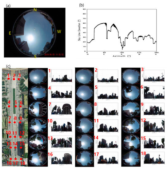 (a) A photo taken of the zenith by a fish-eye lens camera, (b) sky line elevation with respect to the azimuth angle, and (c) sky views and sky line elevations at 18 selected points in the campaign domain.