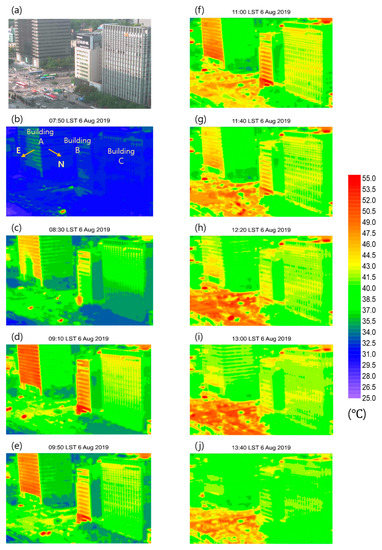 Figure 7 exhibits the horizontal and vertical distributions of the surface temperature at the selected time observed by TIR on 6 August 2019. At 0750 LST, 2 h after sunrise, most surfaces showed similar surface temperatures in the range of 31−34 °C (Figure 7b). On the eastern facades of buildings (Buildings A, B, and C), the surface temperatures increased from 0830 LST, reached a maximum between 0910 LST and 1010 LST, and then decreased (Figure 7c,e). The low surface temperature area on eastern facade of Building A was due to the shade of Building G at 0750 LST and 0830 LST (Figure 1 and Figure 6b,c). Because the solar elevation angle was large between 1100 LST and 1340 LST, the surface temperatures on horizontal surfaces, such as roads and the GHM square, were also large and those on the eastern facades of buildings decreased (Figure 7f,j).