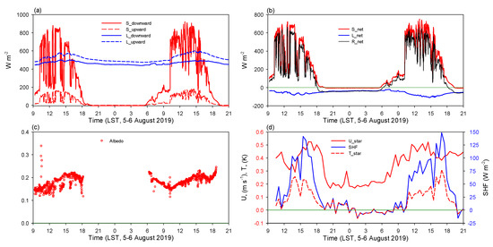 Correspondingly, the friction temperature and sensible heat flux show nearly zero and slightly negative values from 1900 LST on the first day to 1015 LST on the second day (Figure 9d). The friction velocity shows smaller values of approximately 0.2 m s−1 during night-time, and larger values of approximately 0.3−0.5 m s−1 during daytime (Figure 9d) [34].