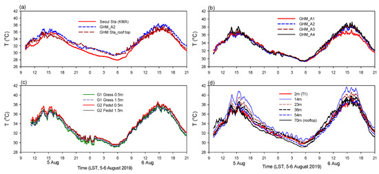 Figure 10 shows the time series of temperature obtained from fixed sites during the BBMEX campaign. Note that the Seoul station is located at a similar elevation as the GHM station of the rooftop of Building D. Nonetheless, the air temperature at the GHM station was higher than that at the Seoul Station by 1.1−1.9 °C at night-time, and the former was similar to the latter in daytime. The temperature inside a BB (GHM_A2) was warmer than that over the rooftop of a BB in daytime, and the former was similar to the latter at night-time (Figure 10a). Site A1 was open to the sun only during the morning time and was shaded by buildings and trees during the remaining time. Thus, GHM_A1 exhibited the lowest temperature among the AWSs in the street canyon except for the morning (Figure 10b). Maximum difference of air temperature between A1 and A2 was 0.9 °C at 1042 LST, while that between A4 and A3 was 2.6 °C at 1535 LST (Figure 3a). On the other hand, GHM_A4 exhibited the highest temperatures in the afternoon due to the heat transfer from not only the underlying surfaces but also the western facades of Buildings D and E (Figure 10b). Because the face of Building D has sensors directed to the west, the temperatures exhibited the highest values at a height of 14 m and decreased with an increase in the heights of the sensors (Figure 10d). A higher temperature at the middle height of Building D implies that the heat, might have been released from ventilators for air conditioning in daytime.