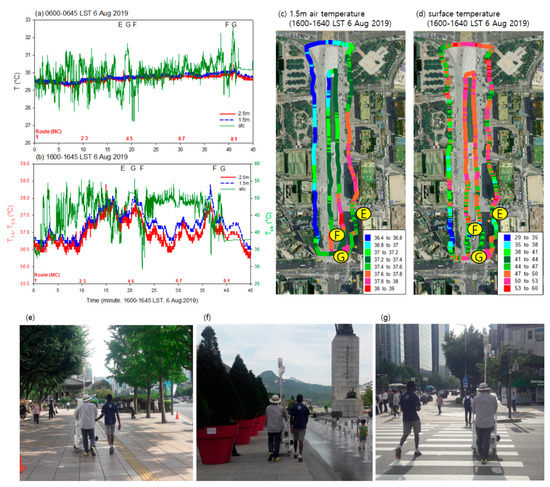 Time series of surface, 1.5 m, and 2.5 m air temperatures obtained by MOCA during (a) 0600-0650 LST, and (b) 1600–1650 LST on 6 August 2019. Horizontal mapping of (c) 1.5 m air temperature and (d) surface temperature on satellite image of BBMEX domain. Landscapes at (e) point E (tree), (f) point F (ground fountain), and (g) point G (road) in (a) and (b). Route number in (a) and (b) indicates the location with its heading MC in Figure 3a.