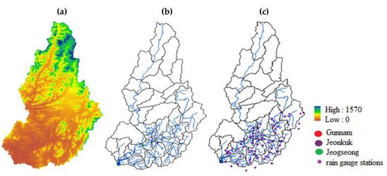 (a) The digital elevation model (DEM) of the Imjin River basin, (b) the sub-basins, river network and water levels and (c) location of rain gauge stations in the Imjin River basin.
