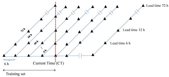 In the current research, real-time forecast meteorological data were produced using the WRF model. The WRF model biases, which led to the inaccuracy of the raw forecast data, were improved by applying the post-processing methods. The TLS and DW methods were applied to correct the biases of the real-time meteorological data, taking into consideration the bias lead-time dependency in the WRF forecast data. The criteria for the bias correction of the WRF data were defined based on removing the biases of the real-time forecast data, which are lead-time dependent. The challenge for real-time forecast correction is to choose an appropriate training data set. For this study, it requires at least a 72 h training period, which is necessary for obtaining the correction coefficients for the TLS and DW methods. For parameter estimation using TLS and DW, a training period of 72 h was selected to obtain the bias correction factor for different lead-times. The structure of the 72 h forecast data and choice of the current time for the bias correction are shown in Figure 2.