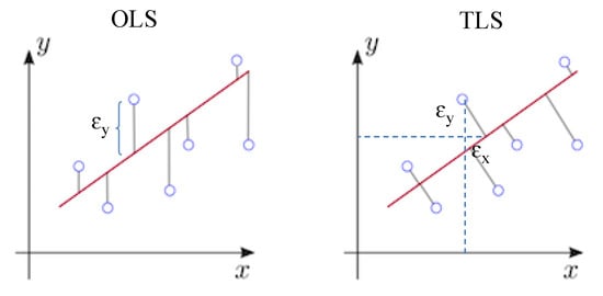 The TLS is similar to OLS, but instead of using vertical residuals, it uses diagonal residuals. The TLS was developed to modify the OLS, since it minimizes the cost function by utilizing the observed and forecast data (Equation (2)).