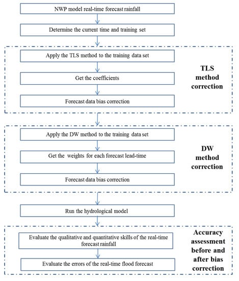 Uncertainties related to NWP real-time rainfall forecasts can have significant impacts on real-time hydrologic forecasts. Therefore, these errors should be assessed and reduced by post-processing methods to prevent error propagation in the flood forecast. Despite the significant impact of forecast errors on flood forecasting, few studies have determined how NWP errors propagate in hydrological model forecasts. In particular, bias correction of the real-time flood forecasting and the effects of forecast lead-time on the biases have not been addressed in this context. Therefore, post-processing methods—especially those that consider the bias lead-time dependency—are necessary.