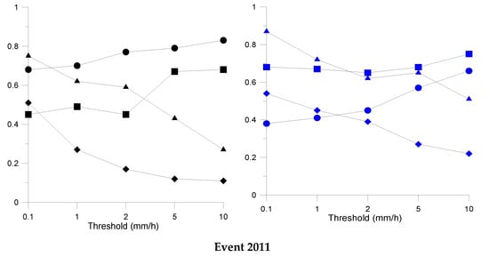 By applying the post-processing methods, the real-time rainfall forecast error decreased and led to an increase in the QPFs performance in all the sub-basins. The TLS and DW methods improved the accuracy of the precipitation forecast by, on average, 72.05%, 48.87% and 45.07% for the events of 2002, 2007 and 2011, respectively. The SI performance measure was used to evaluate the results of applying the TLS and DW methods for the real-time forecast data. The results of the comparison between the raw and bias corrected precipitation data for the SI are shown in Table 2.